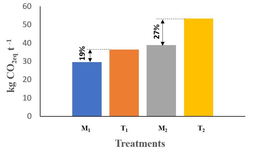 The results show that the mycorrhization increases watermelon yield under standard irrigation (M1=176.4 t/ha), followed by un-mycorrhized plants under standard irrigation (T1=139.8 t/ha), and mycorrhized plants under reduced irrigation (M2=130.6 t/ha), and finally by un-mycorrhized plants under reduced irrigation (T2=88.0 t/ha). Water use efficiency (cubic meters of irrigation water for producing 1 ton of watermelon fruits) is highest in mycorrhized plants under standard and reduced irrigation (M1 = 39.8 m3 per 1 ton of fruits; M2 = 43.4 m3 per 1 ton of fruits) whereas in un-mycorrhized plants under standard (T1) and reduced irrigation (T2) are necessary 50.1 and 64.4 m3 per 1 ton of fruits, respectively. Moreover, mycorrhization reduces the total emissions of carbon dioxide equivalent per ton of marketable watermelon collected, in correspondence with both irrigation regimes. Figure 1 indicates the effect of the mycorrhization on CO2 saving concerning the witness (T1, T2) is more considerable in plants subject to water stress (27%) compared to those grown in conditions of optimal water availability (19%). The lowest absolute values of CO2 equivalent emissions are obtained in the treatment that involves the mycorrhization of irrigated plants with standard irrigation (M1). The mycorrhization reduces the emissions of all inputs used due to an effect on increasing the production of marketable watermelon with the same input consumption. On the contrary, water stress increases emissions of carbon dioxide equivalent per ton of marketable watermelon due to a reduction in production compared to standard irrigation treatments.
