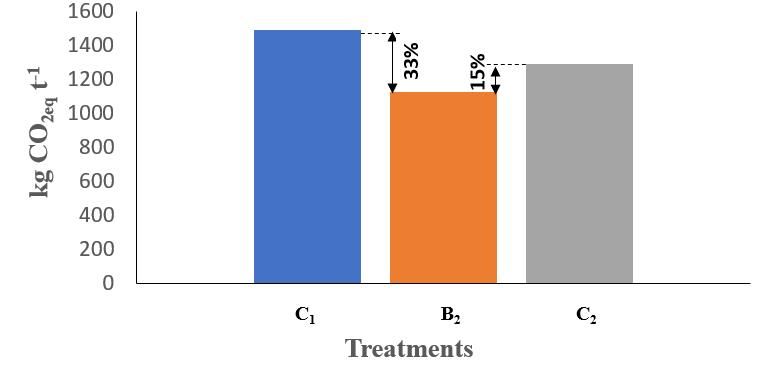 The results show that biostimulant treatment plus micronutrients increases maize yield (B2 =10.3 t/ha) while plants fertilized with the same amount of NPK of B2 treatment provide a grain yield of 8.98 t/ha (C2). Plants fertilized with the highest rate of nitrogen (300 kg/ha) without the biostimulant and micronutrients application give an intermediate yield (C1=9.87 t/ha). Nitrogen use efficiency is higher in plants treated with biostimulant and micronutrients (B2=19.4 kg of N for producing 1 ton of maize grains) in comparison with plants treated with mineral fertilizers without biostimulants and micronutrients (C1 = 30.4 kg of N for producing 1 ton of grain; C2 = 22.3 kg of N for producing 1 ton of grain). The results of greenhouse gas calculation in maize production under defined treatments reveal that the foliar supply of biostimulant and microelements (B2) reduces total emissions of carbon dioxide equivalent per ton of grain harvested compared to the treatment that provides the same contribution of fertilizer, but without foliar application of biostimulant and microelements (C2). Figure 2 shows the increase in the contribution of nitrogen fertilizer (C1) increases the total equivalent carbon dioxide emissions per ton of maize crop by 33% compared to the treatment that involves lower nitrogen inputs along with biostimulant and microelement-based fertilizer (B2); this increase is 15% compared to the treatment with a reduction in nitrogen quantity and without application of biostimulant and microelement-based fertilizer (C2).