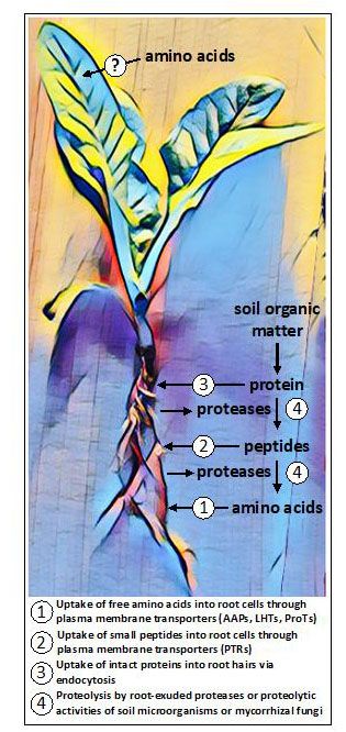 In mycorrhizal plants, fungal symbionts contribute to the uptake of amino acids and peptides. Mycorrhizas also exhibit proteolytic activities that, together with those of free-living microbes in the soil, make amino acids bound in proteins and peptides available to plants (Näsholm et al., 2009) (Figure 1).