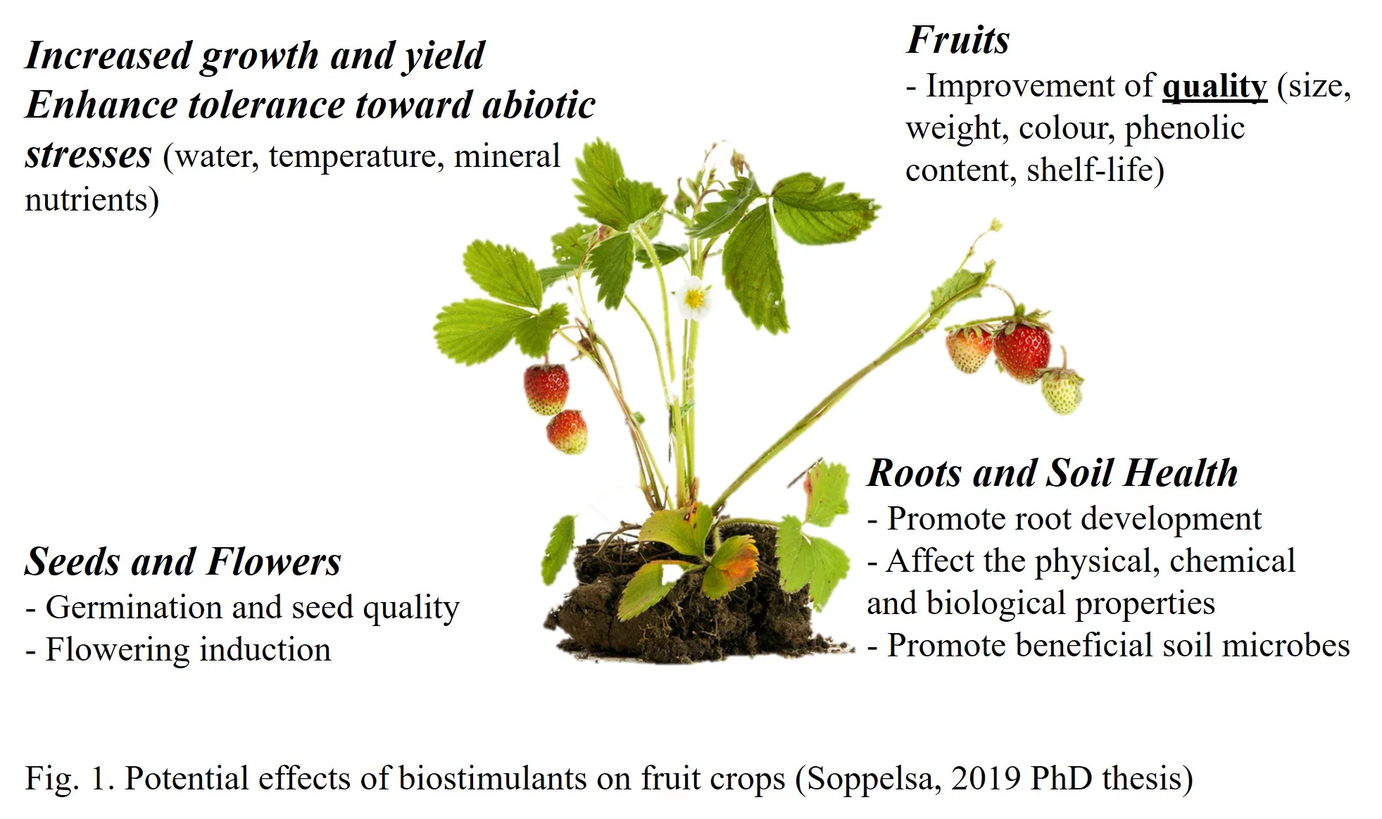 The scientific evidences of a positive effect of biostimulants on crop yield has not been univocally achieved when fruit trees are considered. Differently from other annual crops (vegetables, cereals), perennial plants are highly influenced by the “carry-over” effects on growth, cropping and metabolic reserves accumulation from one season to the next. Within this framework, it is not surprising that more evident improvement of crop yield in fruit crops have been achieved on trees experiencing biotic or abiotic stresses (drought, nutrient limitation, pathogens), or in trees experiencing alternate bearing (i.e. in olive and apple trees).